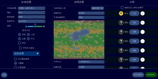 难度:一般选择仙人/天神,默认使用标速远古开局(联机pve则是快速),胜利方式除分数外全开。由于蛮族大多数情况下会恶心玩家,故可以不开。核弹间谍随意,因为没有用...